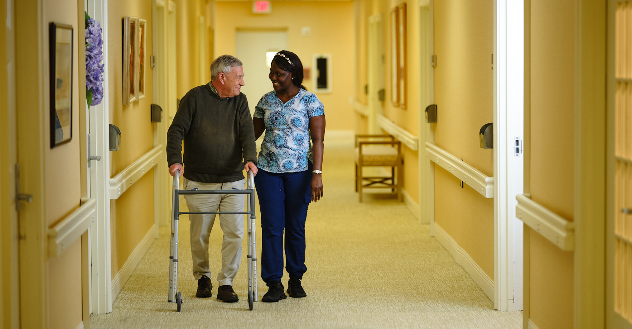 A Goodwin House Bailey’s Crossroads nurse and resident in the hallway