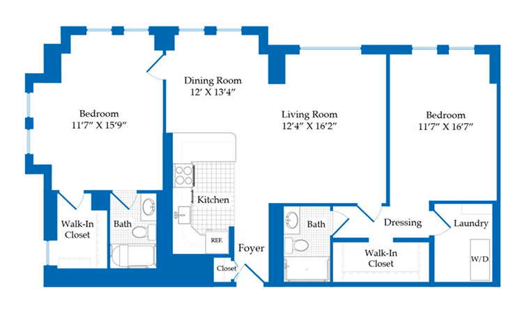 This 1,281 sq. ft. two-bedroom, two-bath apartment includes a full kitchen, spacious living areas and large closets.