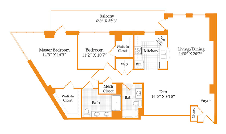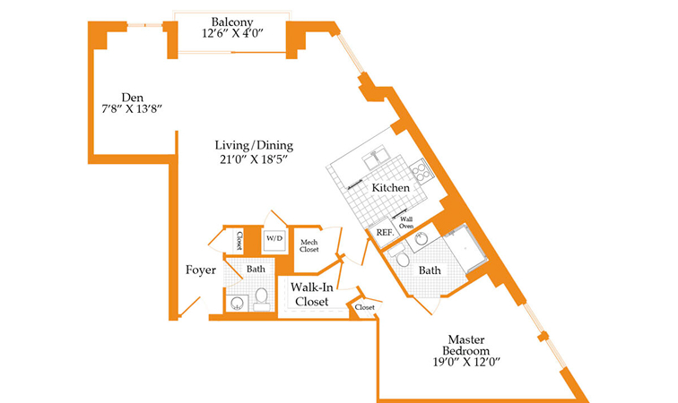 This 1,140 sq. ft. one-bedroom plus den includes one and a half baths, a full kitchen and flexible living space.
