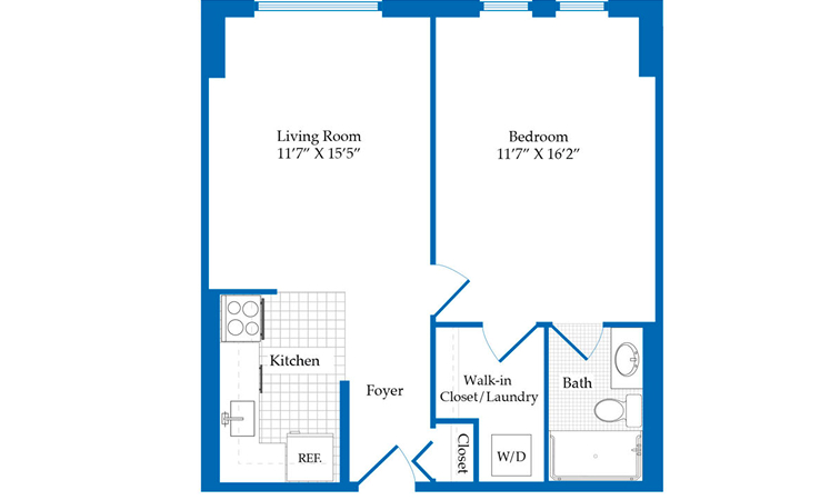 This 590 sq. ft. one-bedroom apartment features one bath, a full kitchen and a thoughtful layout.